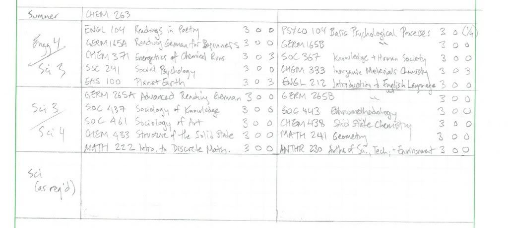 You'll notice that it looks a lot like it's a chemistry major, but it's not. I'm actually going to have my major in the "physical sciences" (includes chem, physics, geology) so that my physics credits from engineering count for something.