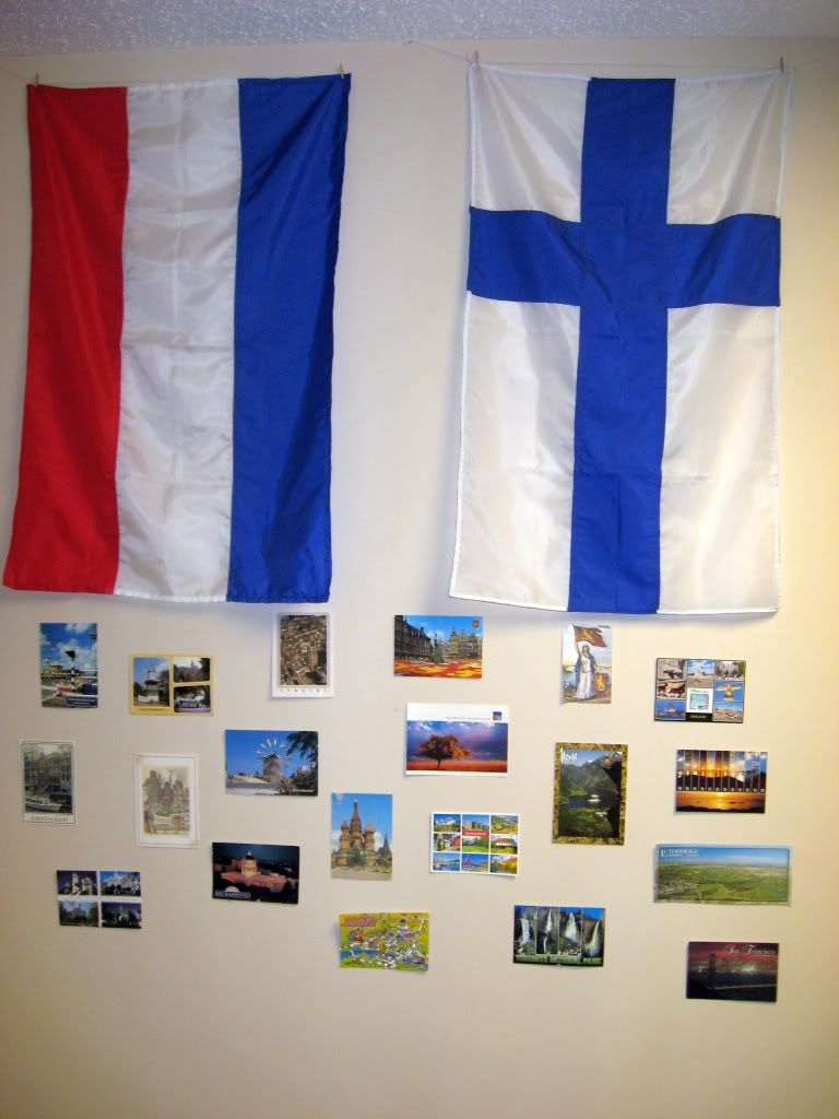 I've got lots of stuff on the walls of my room, but it's not the posters that are significant to me (and there actually aren't that many posters). There's the Finnish flag (and Dutch flag) that I made, for obvious reasons. And this painting, which I really don't want to explain because it hurts.