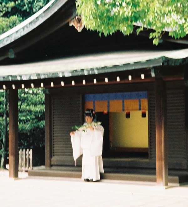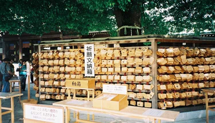 There were several walls of prayer tablets at the Meiji Shrine (明治神官). You buy blank wooden tablets and then you're supposed to write your wish on it. Then the priests burn them. There were ones written in all sorts of languages, like Korean, or Dutch, or Thai, or whatever. There was some head priest sort of guy with a big flowering branch and he's supposed to stand as still as a rock and whack people with it if they get too close.